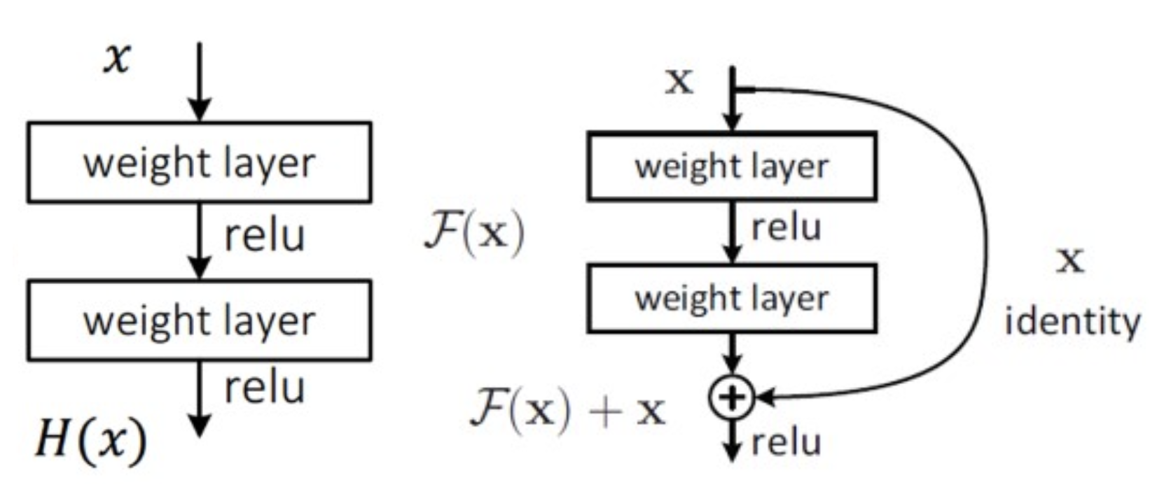 - 이는 이상적인 출력값 $ H(x) $와 입력값 $ x $간 차이(잔차, Residual)를 구하도록 함수 F가 갖는 파라미터를 조정하라는 것으로 문제가 바뀌었음을 의미한다.