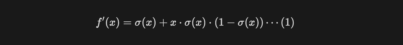 따라서 덧셈을 기준으로 두번째 항 $x \cdot \sigma(x) \cdot(1- \sigma(x))$은 $x\cdot \sigma(x) \approx 0$이고, $1-\sigma(x)$는 1에 근사하는 값이므로 두 값의 곱은 0에 근사하는 값이 된다.