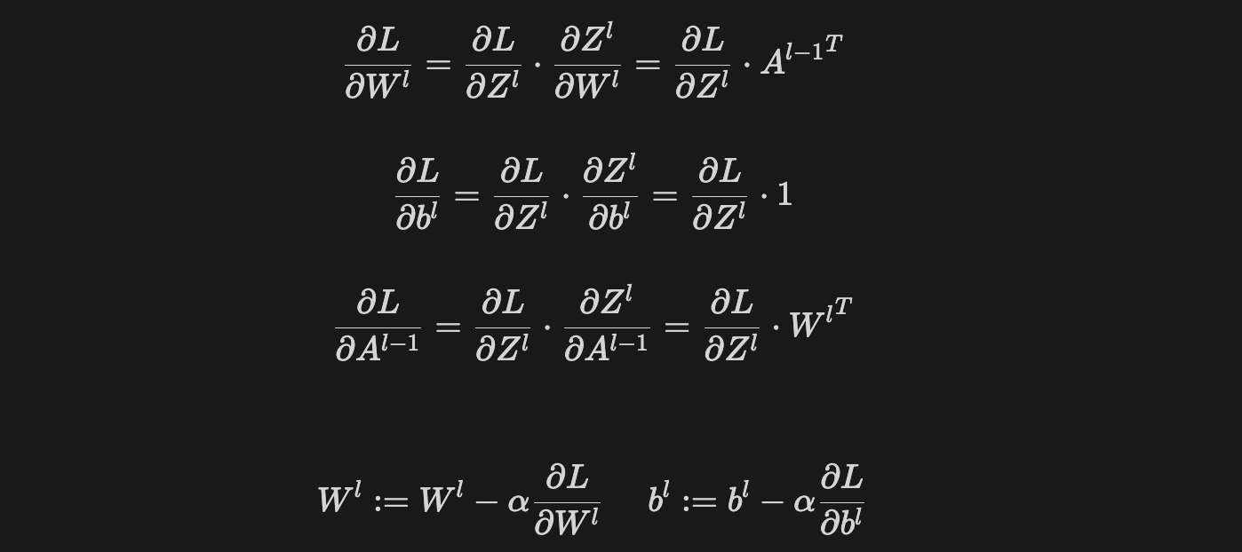 bias에 대해서는 계산이 정말 간단한데, $Z = {A^{l-1}}^TW + b $에서 b는 단순한 상수이기 때문에 편미분을 수행한 결과가 1이다. 따라서 $ \frac{\partial L}{\partial b^l} = \frac{\partial L}{\partial Z^l} \cdot 1 $이다.
