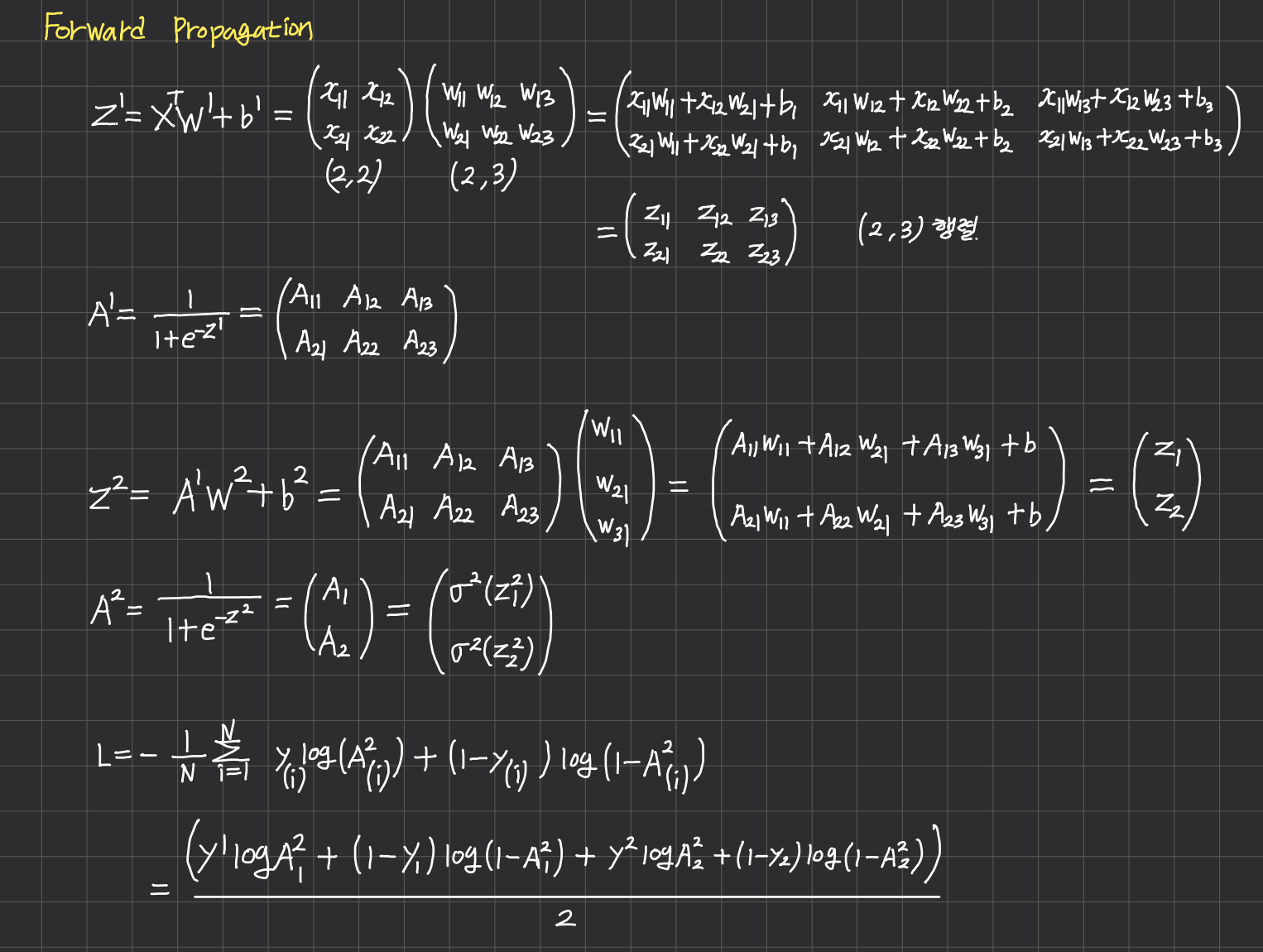 출력층의 활성화함수가 출력한 값이 모델의 예측인 $ \hat Y $이고 정답 $ Y $ 와 함께 손실함수에 입력되어 손실함수 값을 구했다. 따라서 손실함수에 대한 출력층의 미분은 $ \frac{\partial L}{\partial A^{[2]}} $로 시작한다.