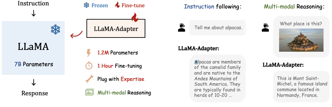 LLama 모델을 instruction 모델로 미세 조정할 때 효율적으로 하기 위한 방법이다. 학습 가능한 프롬프트 토큰을 상위 Transformer layer의 입력 텍스트 토큰 앞에 추가해 학습한다.